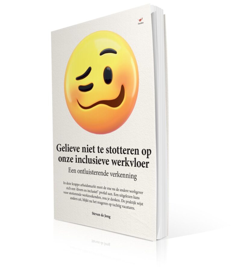 Waarom dan toch dit stigmatiserende beeld op dit boek? Omdat het veelzeggend is voor hoe ‘personen die stotteren’ beoordeeld worden. Er heerst het misverstand dat iedereen ervanaf kan komen. “Blijf werken aan je spraakhandicap”, las Steven de Jong in zijn functioneringsverslag. Jarenlang werd hij in spraakarme functies geïsoleerd totdat hij kenbaar maakte dat niet het stotteren hem beperkte, maar de werkomgeving. In dit boek sluit hij zich aan bij de internationale beweging voor het ‘recht om te stotteren’.